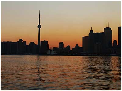 August 14, 2003 — The Toronto skyline is seen in darkness against the setting sun during the masive power outtage Thursday. Photo by Peter J Thompson/National Post