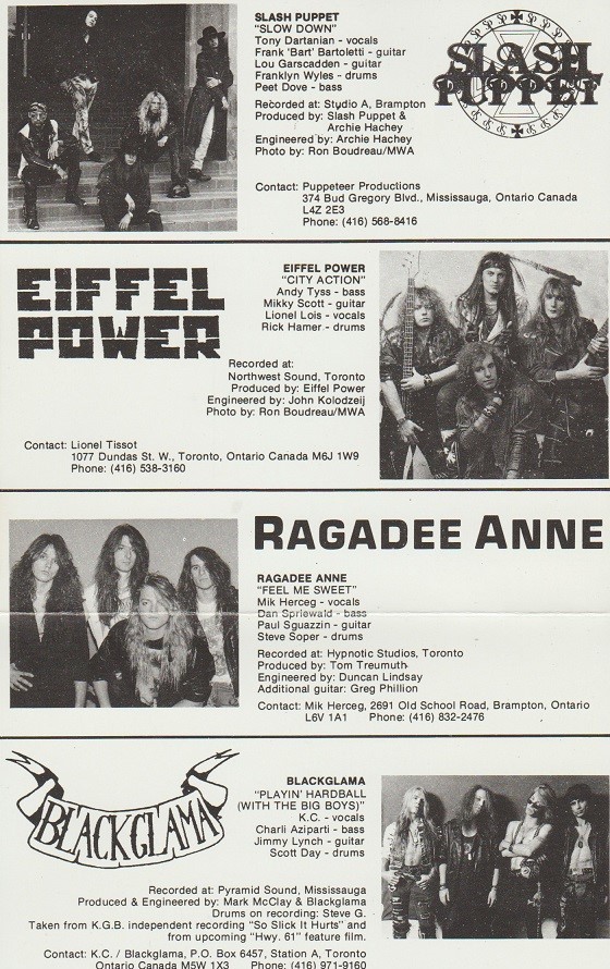 Eiffel Power, from Taranna, knocked it out with “City Action”.  Singer Lionel Lois  had ample range and lung capacity for this fun metal shuffle, very current for the time.  Think of Extreme’s first album but with more muscle.  Then there’s the instantly likeable “Feel Me Sweet” by Brampton’s own Ragadee Anne.  Yes, it’s true:  coming up with names for bands isn’t always easy, but “Feel Me Sweet” kicks.  One reason they sound so professional is due to the production by Tom Treumuth (Triumph), surely an advantage in the studio.  Glam rock with bite and youthful innocence sure sounds good.