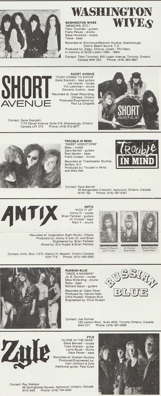 Blackglama (Toronto) take it to the streets with the rock/rap hybrid of “Playin’ Hardball (With the Big Boys)”.  This was just a year or two ahead of its time, though director Bruce McDonald used it in his 1991 film Highway 61  (but not the soundtrack CD).  The next group, Washington Wives, bring it to immaculately composed AOR rock.  “Memoirs, Etc.” has backing vocals from Phil Naro, from just across the border in Buffalo.  Naro is best known for Talas and his work with Kiss’ Peter Criss.  “Memoirs, Etc.” is vaguely familiar, as if you’ve heard its like on the radio before (Journey? Night Ranger?), but there’s no question this track was hit-ready.  Zero fat content, this is all meat of the most melodic variety.