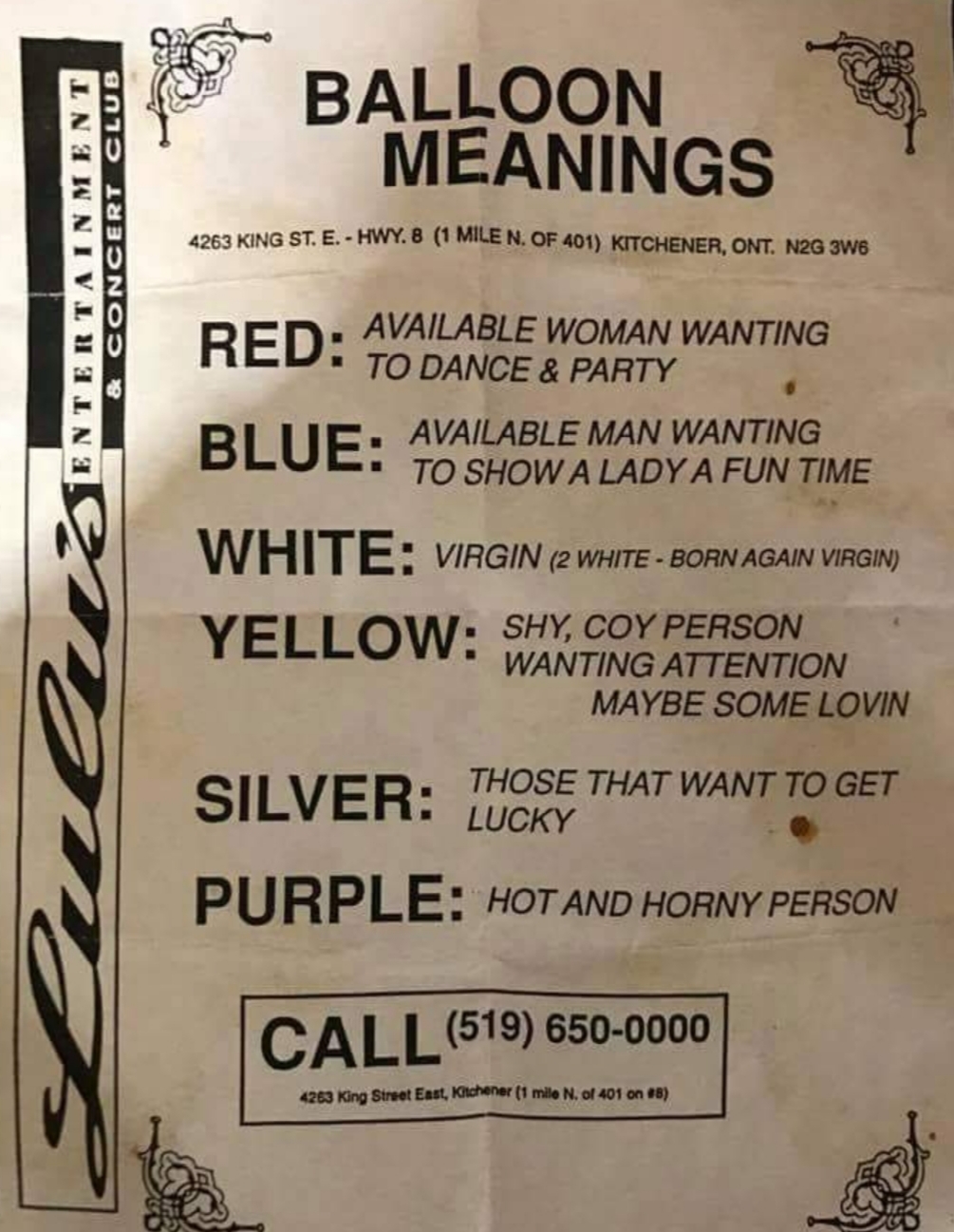 It seems that few mysteries remain unsolved in the age of the internet. A local resident dug up an old “balloon meanings” flyer from Lulu’s and the mystery is finally answered:
