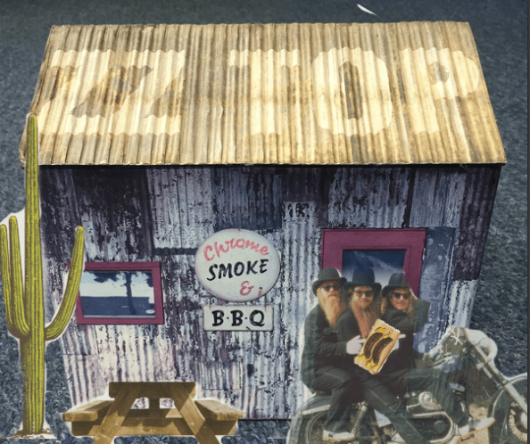Limited edition box sets are fun to get while they last. Chrome, Smoke & BBQ boasts its box shaped like a steel shack, including corrugated roof. (It’s actually great because it doesn’t collect dust!) Include the box, all four CDs are safely housed in individual jewel cases. If you dig inside a little more you’ll find cut-out characters to add to your BBQ shack display. You could scan and print these cut-outs yourself. Enjoy a picnic table, ribs, sausages, cacti, and of course the guys from ZZ Top themselves (on a bike, or disembarked). Also hidden in the box is an animated flip-book. See the video below for a quick demonstration.