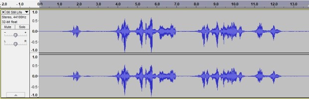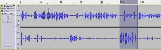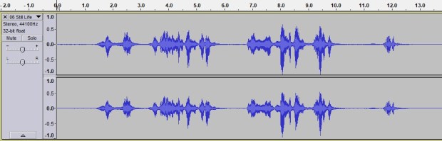 STEP 2: Record your vinyl (forwards) into Audacity using a USB turntable. Or, even easier: load any track from your computer into Audacity. For this demonstration we’re using the aforementioned “Still Life” by Iron Maiden. The backwards spoken word Nicko bit is isolated by deleting the entire rest of the song. (I’ve also boosted the volume on this part, which is quite quiet. Now you can see the waveform more easily.)