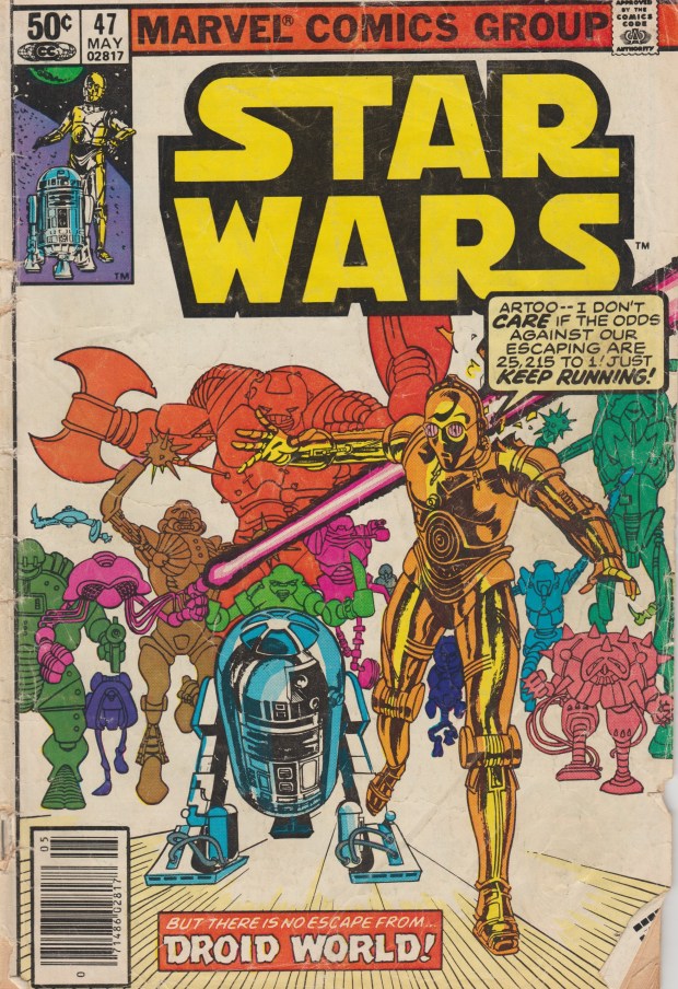So now I have to re-buy all the Trek movies. I can do without the series as they are all on Netflix, but I need the films back. I don’t know what to buy: blu-ray, DVD, whatever has the best content? This would have been simpler had I just kept them all. A couple weeks ago I re-bought an old Star Wars comic that I somehow lost. It must have left the house accidentally jammed between something else because I never would have gotten rid of issue #47, “Droid World”. It’s the only issue that means anything to me and the only one I want to have. I used to try and draw all the different robots inside over and over again. Cost me $5 to replace, but oh well. Never should have left the house.