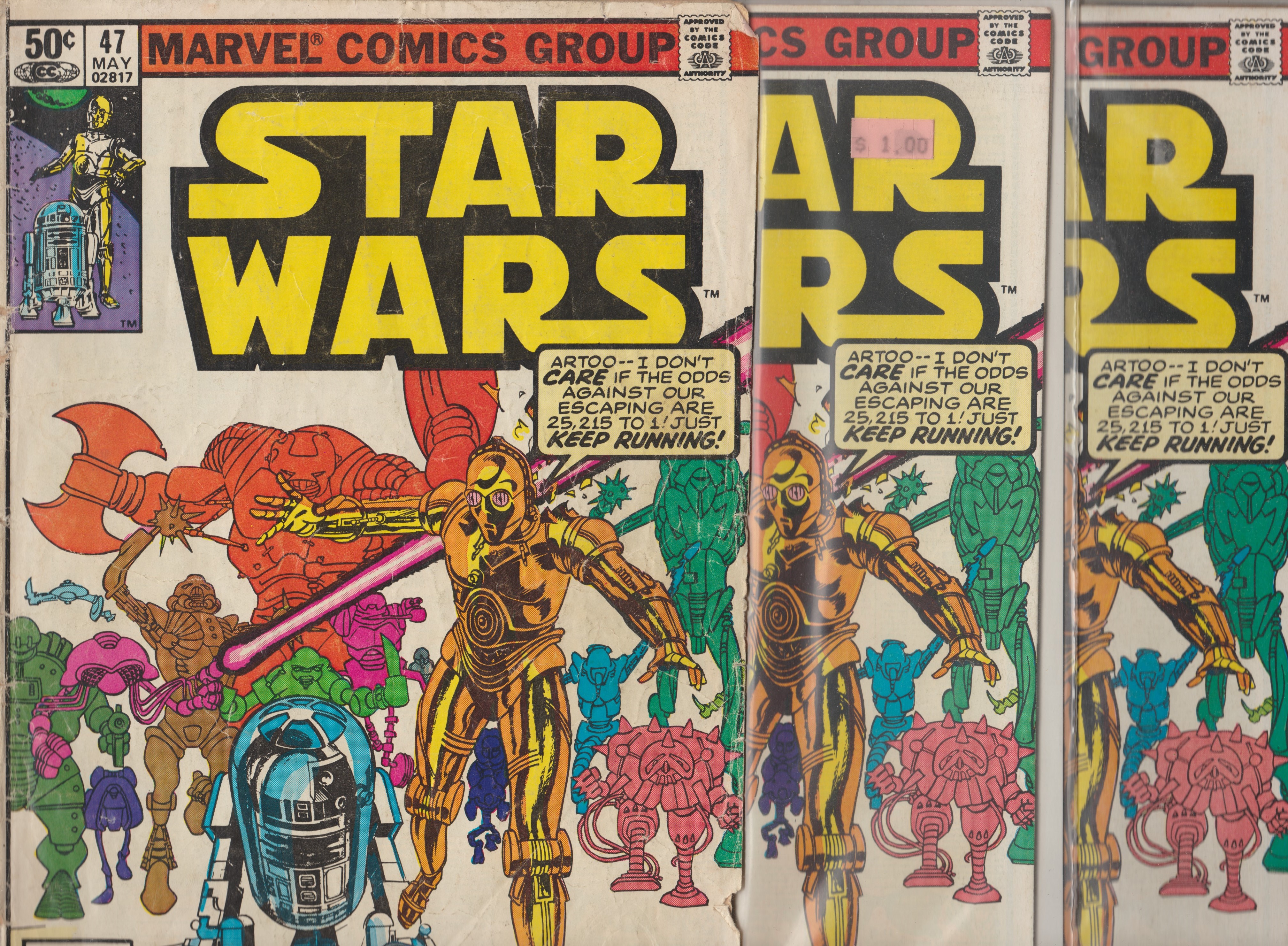 My favourite single comic book growing up was Marvel Star Wars issue #47: “Droid World”. I have three copies today including the one I originally had back in 1981. The post-Empire period is the one I remember most fondly, even though Han Solo was absent from the story, frozen in Jabba’s dungeon. I took this issue everywhere with me. It is tattered but still barely holding together. At the lake or at home, I kept it near. I tried to draw the robots inside, with the comic pages splashed open on the driveway. Best friend friend Bob was with me with pen in hand.