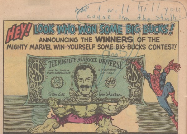 I recently opened it again and came across a page that had to be Bob’s handiwork. He was the destructive one, not me. In ink he scrawled a word bubble on an ad page featuring the Hulk and a dollar bill with the face of Stan Lee. Stan Lee + Hulk = Stulk?