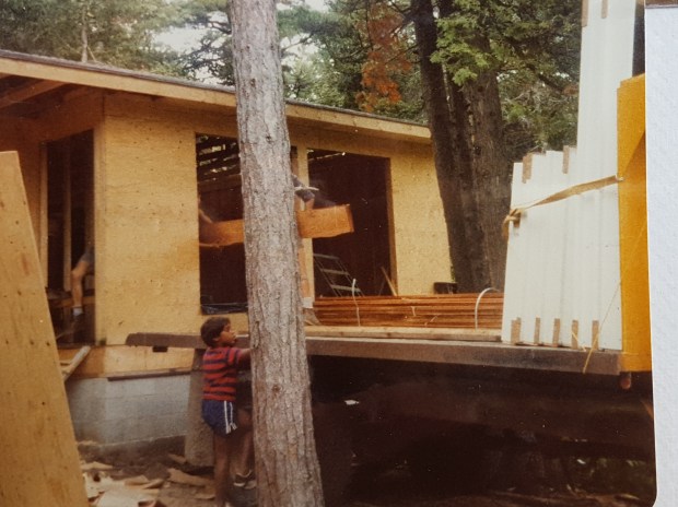 I would have met Searle over 45 years ago now. Our cottage was built on this land in 1980, and we have a photo of Searle straining to look at a load of wood siding and windows, being delivered here, dated July 1980. Indeed, it was his curiosity that brought him here. A project as big as building a cottage draws onlookers, and he was only a couple properties over.