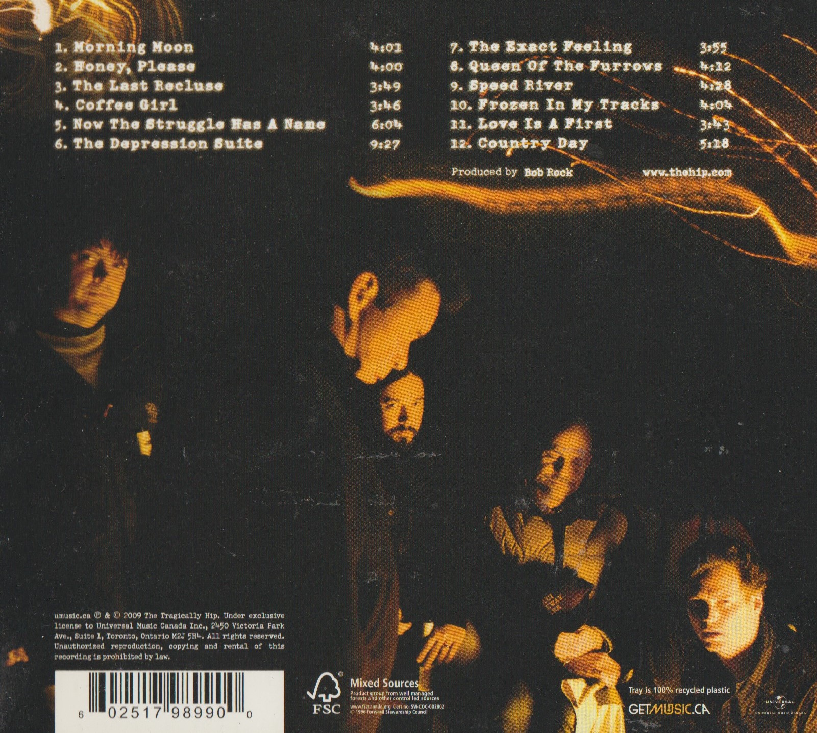 The days of “Little Bones” and “New Orleans is Sinking” are long behind now. The Hip don’t write albums like that anymore, but what they do create still has innate power. Listen to the acoustics and the slides blending with the electric guitars and steady beat of Johnny Fay. The Hip run like a well oiled…gotta say it…Man Machine. The older, wiser, and less loud Tragically Hip still rock, cranking it up when necessary. “Here, in the Dark” is a fine example of placing the explosive charges in the exact right spots. So is the growling “Hot Mic.” The energy is palpable. Even on a song called “Tired as Fuck”, there is energy in the air.