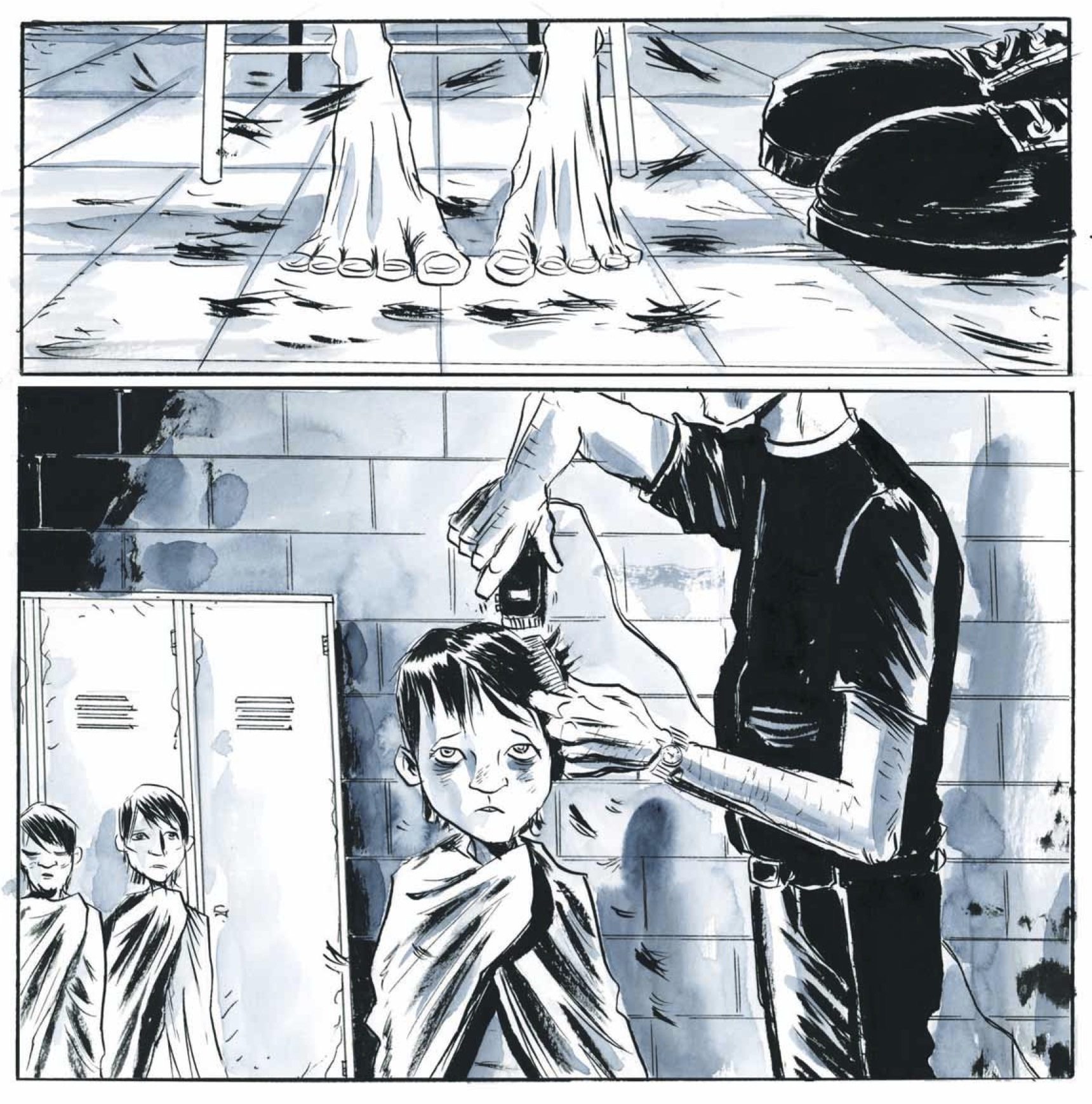 It was October of ’66 and the story begins with Chanie already on his way home. Alone, following the train tracks, Wenjack is illustrated in stark black, blue and white. The trees are bare, and ravens circle free overhead. Chanie’s story is told in the form of flashbacks. His thoughts go back to happier times, fishing with his father. These memories are in full, beautiful watercolour. Lemire captures the love in his drawings.