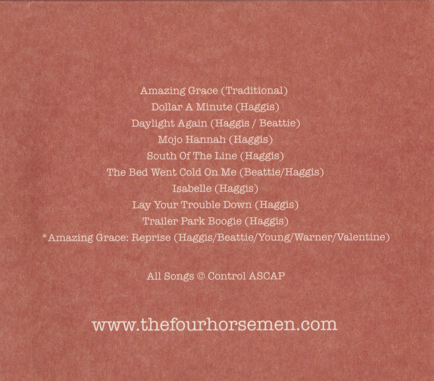 Daylight Again wasn’t intended for release as-is. These are cassette and DAT recordings, cleaned up as much as possible for CD. Hiss and noise are part of the deal, so buyer beware, this is not the gloss of a Rick Rubin production. You can taste the rawness; not even blue-rare, just pure raw blues unfettered by mixing consoles. The sound is modified by banjos and pedal steel. The location is somewhere in the deep south. You can feel the humidity in the rehearsal space and sense the hot tube amps humming away. Somewhere in between the Allmans and Skynyrd, the Horsemen found some inspiration from old grooves.
