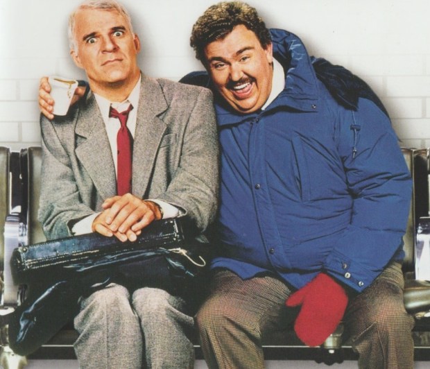 Steve Martin plays Neal as an impatient cynical grouch who is dying to get out of the sales meeting he’s stuck in so that he can find a cab and get to the airport on time. Del plays the happy go lucky salesman that accidentally steals Neal’s cab during rush hour in New York City. Fate keeps these two characters together as they meet by chance at the airport again. Neal confronts Del about stealing the cab, and Del feels genuine remorse. He tries to be as affable as possible, offering up Neal a beer and a hot dog. Neal being a bit prudish rejects the peace offering with a snarky type of politeness. Of course, Del doesn’t immediately pick up on or at least chooses to ignore Neal’s hostility. All he wants is to get home in a timely manner to see his family for the holiday. A snowstorm prevents their plane from landing in Illinois, causing the flight to divert all the way to Kansas.