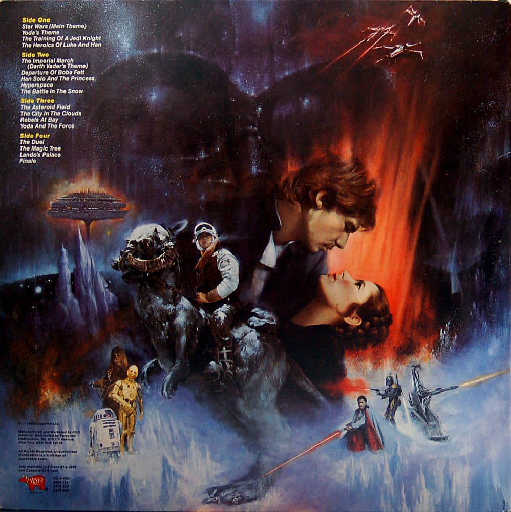 I used my parents’ big living room hi-fi. Giant wooden speakers as heavy as oak doors. A turntable, an 8-track, and a receiver. Once I discovered Star Wars, I think I used it more than they did. The Empire Strikes Back came in a luxurious gatefold, with photos from the film, liner notes, and a generous booklet. It didn’t take long for the rips and tears to set in; that record was well loved. Usually, I would plug in the set of headphones and listen quietly while turning the pages of that booklet. On weekends, my sister and I would probably set up a big battlefield and re-enact the movies, with the soundtrack playing in the background. The most frequently played tracks were “Yoda’s Theme”, “The Asteroid Field” and of course “The Imperial March”. Sometimes we would ambitiously re-enact the entire movie in sequence using the whole soundtrack.