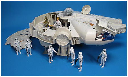 Before anyone gets too nostalgic for the good old days, I’ll remind you those Kenner toys were actually quite shit. My two biggest toys, the Falcon and the X-Wing, both broke immediately out of the box. The wings on the X-Wing never worked right and I had to wedge marker lids in the wings to keep them open. The hinge for the boarding ramp of the Falcon snapped when my dad put it together. He tried to glue it, but ultimately the door was held on by an ugly piece of masking tape. Sturdy toys they were not, and parts were always popping off. The guns refused to stay on the wings of the X-Wing. The canopy of the Falcon always popped open mid-flight. It too eventually got locked down by masking tape.