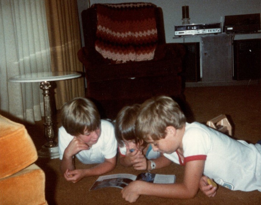 It always came back to Star Wars. Return of the Jedi was brand new. When Geoff was visiting, we wanted to see it again in the theatre, but as explained in the story, we were vetoed by the adults. We saw Superman III instead. (Be sure to read the full story.) And, as described in many previous chapters, you couldn’t just watch a Star Wars at home like today. So we had to use our imaginations. I can easily see what we are reading in this picture.