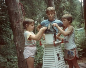 Geoff’s visit in the summer of ’83 launched with a trip to the lake. My Aunt Lynda loves the cottage and so it was a special place for her too. The photos tell the stories. As a kid (and adult) I was obsessed with lighthouses, and my Grandfather made this amazing example. It had lights inside and opening doors. But you can see, we kids just treated it as another toy! It appears that Geoff knocked out one of the windows, which is hanging from the edge.