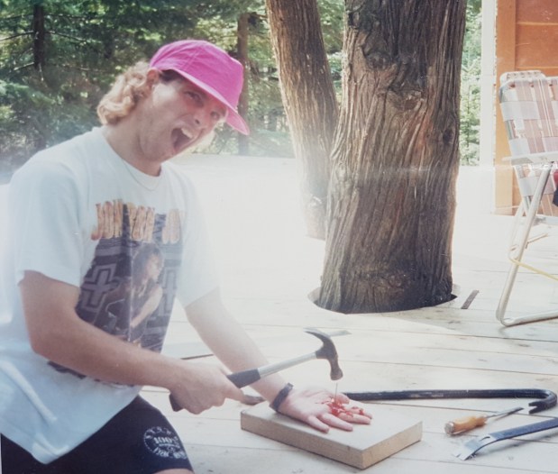 The 80s turned into the 90s. I’ve written extensively about the summer of 1991, and the photos show change! The old brown back deck was never meant to be a permanent fixture. In ’91 we designed and built a bigger and better deck. It was my job to cut out holes for the trees to grow through and you can see this in the photos. Or at least you can see me goofing around for the cameras in my beloved Jon Bon Jovi Blaze of Glory T-shirt. I bought that album there, on cassette the previous year. The “bloody” scene was caused by a bottle of ketchup, cropped out of the photo (but left in on the original print). Neon pink was in at the time, by the way.