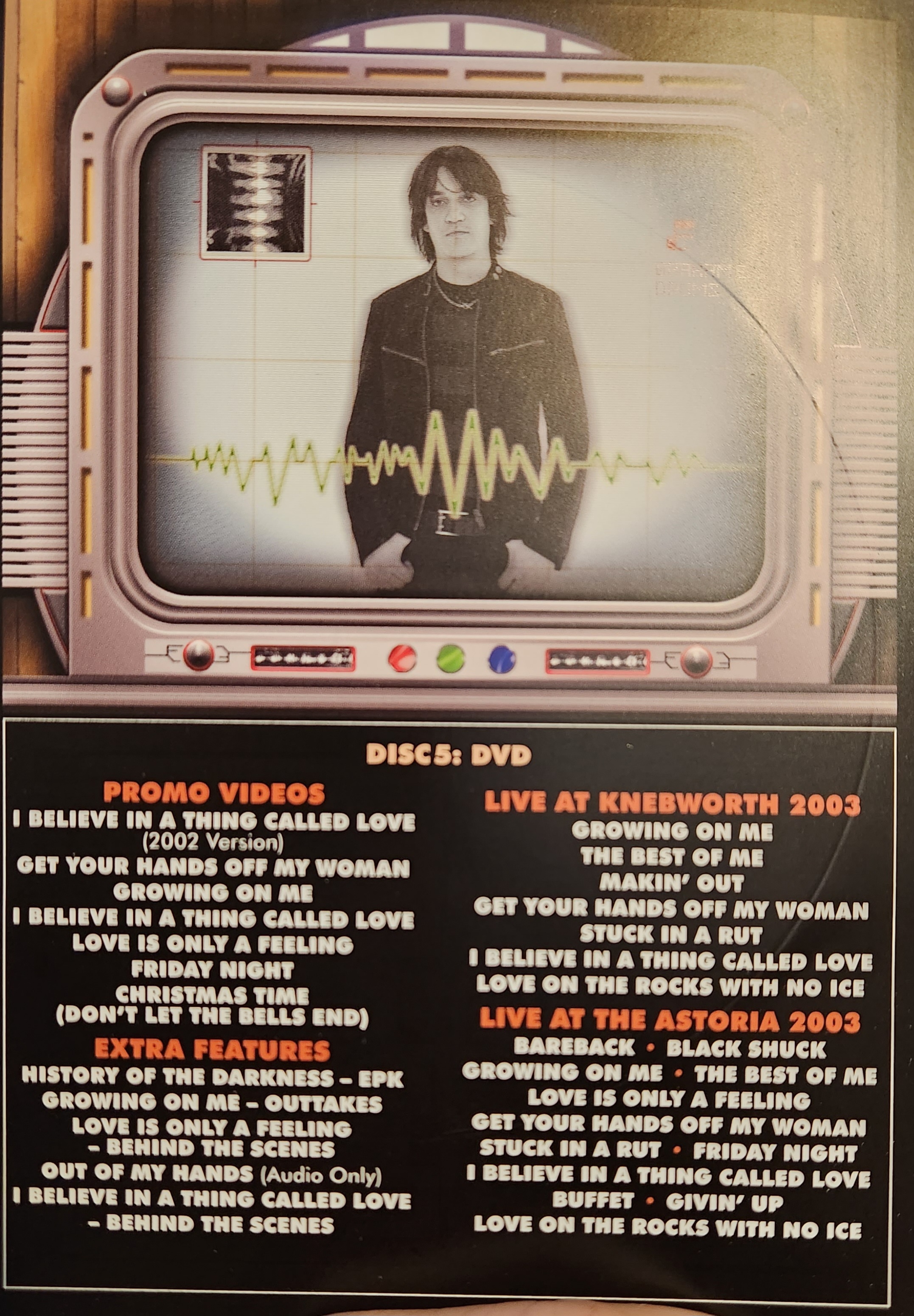The 2003 set at Knebworth is brilliant. Opening with “Growing On Me”, the band has a bizarre and comedic stage presence, but the song kicks! They are a tight band, and a beat is not missed. They play two B-sides, a manic “The Best of Me” (for dancing, says Justin) and the classic “Makin’ Out”. “I Believe In A Thing Called Love” from the Knebworth concert was previously issued on a German version of the Christmas single. I like when Justin asks the audience which version of “Get Your Hands Off My Woman” they’d like to hear, clean or dirty?